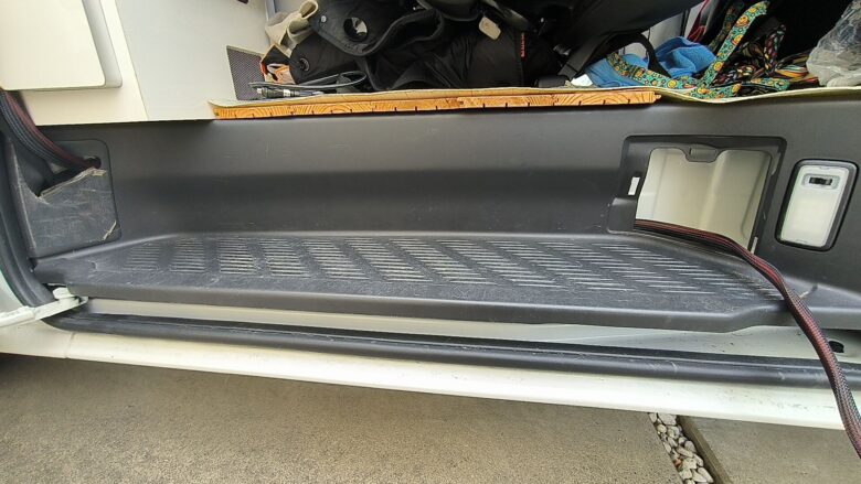 私のハイエースは、後部座席のシートベルトからサイドステップを通線して、