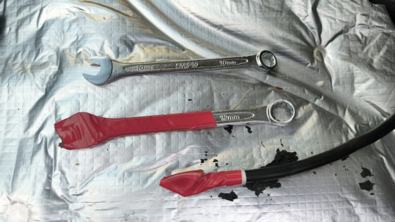 作業の注意点ですが、バッテリーのプラス側に線を接続するとき、スパナが他の金属部に触れると危険☢ですので、必ずテープなどで養生してから作業してください。また、配線時に線の端子部が金属部に触れても危険な為、端子部を養生してください。