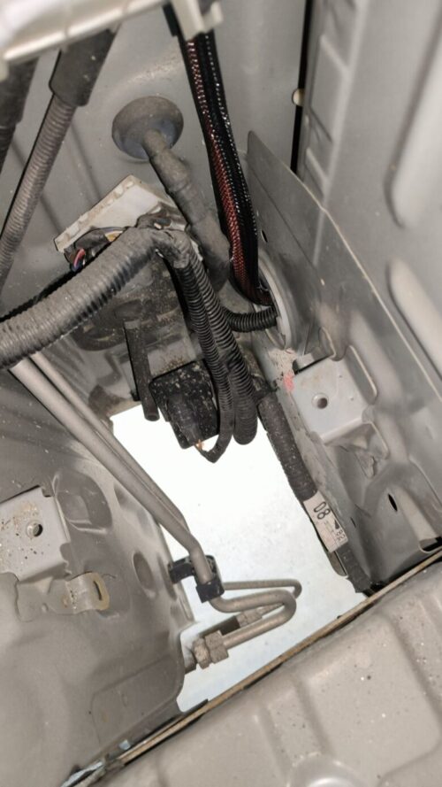 運転席後方の寒冷地仕様のバッテリー収納箇所を通線して、