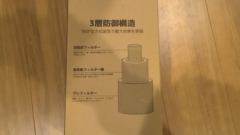 箱から開けてまず驚いたのが、そのサイズ感です。横170mm、奥行き170mm、高さ250mm と非常にコンパクトで、これ、本当に空気清浄機?と疑いたくなるほどスタイリッシュ。まるでオシャレなスマートスピーカーのようです。