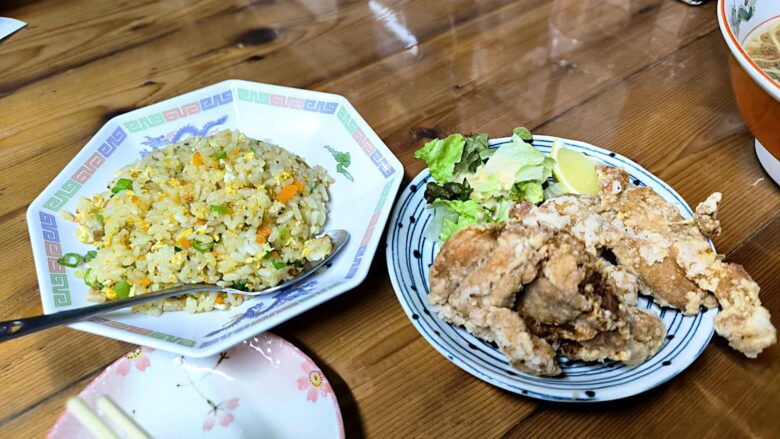 唐揚げはお皿からはみ出るくらい大きかったです。